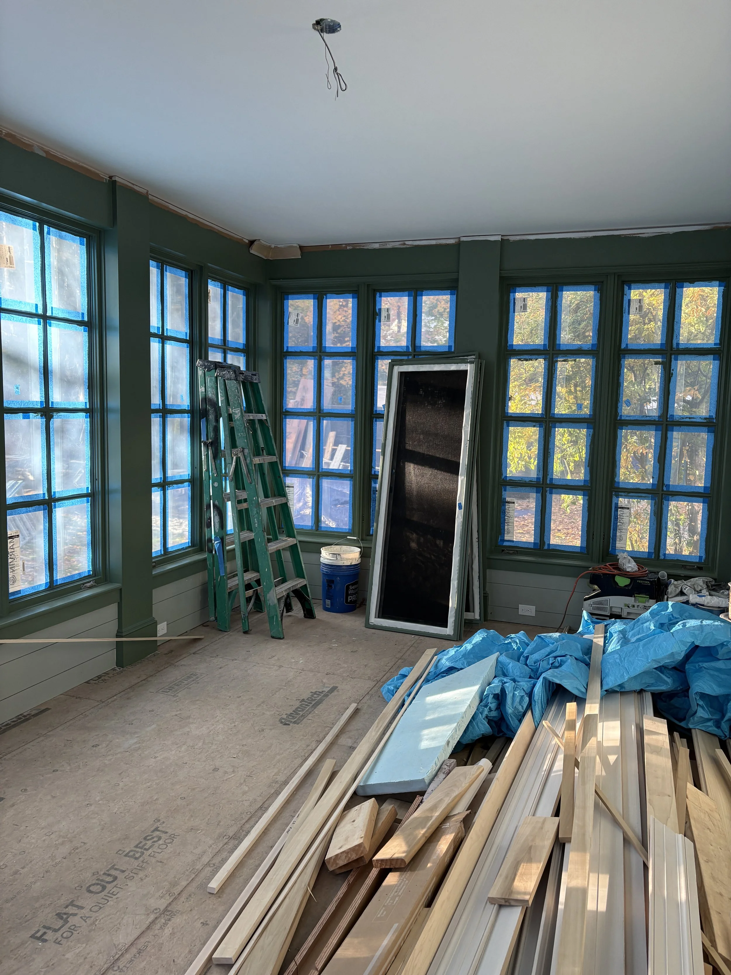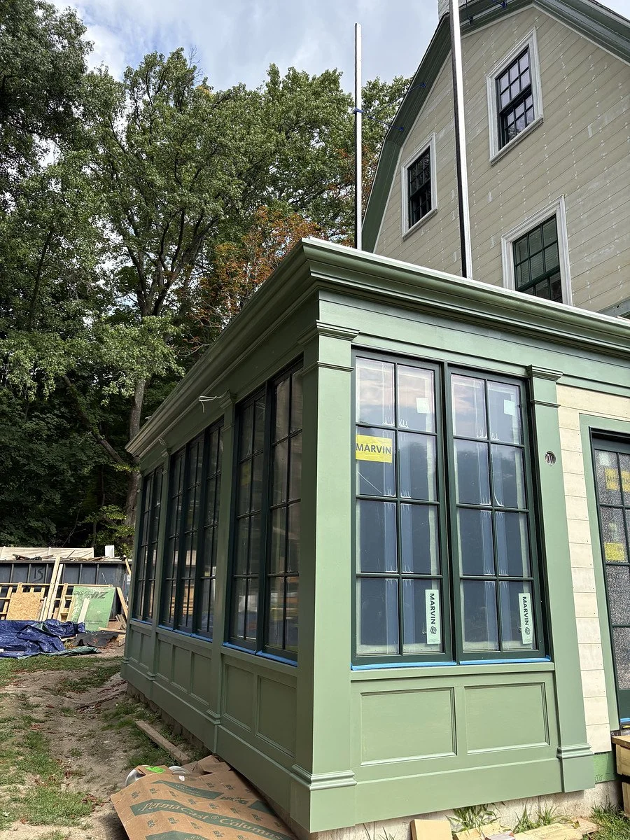 Part of the renovation of this historic home in Milton includes rebuilding the porch with new energy-efficient windows, insulated flooring and upgraded framing. We have collaborated with Schiefer Woodworking on this project. The painting inside has just been completed, and it won’t be much longer until our clients can enjoy this space year-round. Again, floor-to-ceiling Marvin windows bring in sunlight, while a door leads to a new patio under construction. Millwork details inside and outside echo the architectural style of the house.