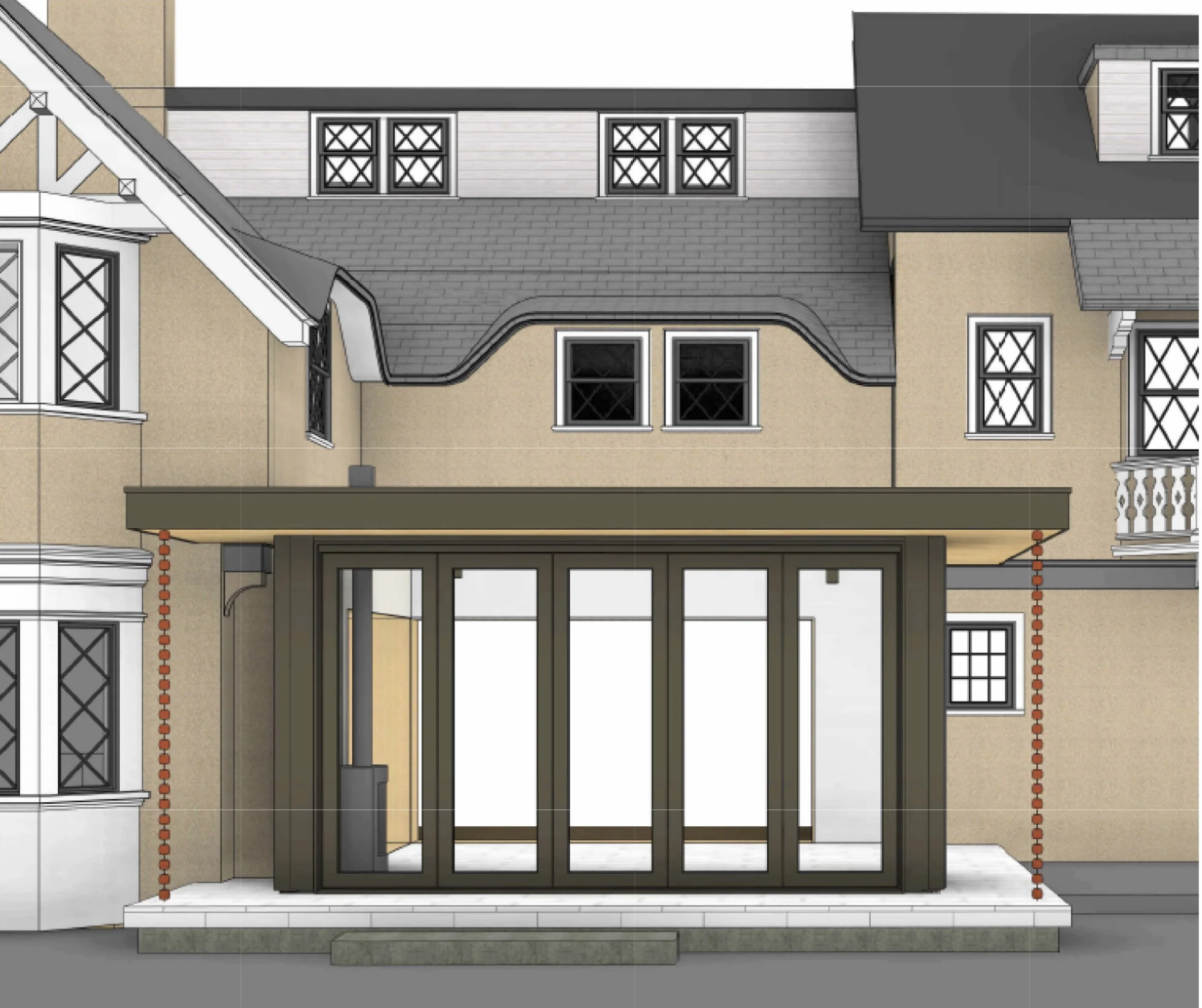 Another sunroom project getting underway provides a more modern approach to converting the old screened porch into a year-round space for a Tudor-style house in Dover. The HDG architect team expanded the opening to the kitchen on one wall and to the dining room on an adjacent wall, offering improved circulation on the first floor of the home. The ceiling will be clad in a tongue-and-groove pattern of Nordic spruce. A slate tile floor continues beyond the Marvin sliding bi-fold doors, and steps down to a new patio to be built along with the new enlarged sunroom. Note the modern Rais Caro fireplace that contributes to the overall contemporary look of the space.